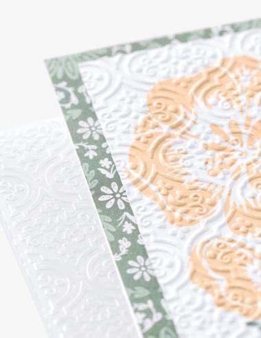 Get this look by inking the embossing folder before running it through the Stampin’ Cut & Emboss Machine. Add more ink to the embossed image with a Blending Brush (p. 129).