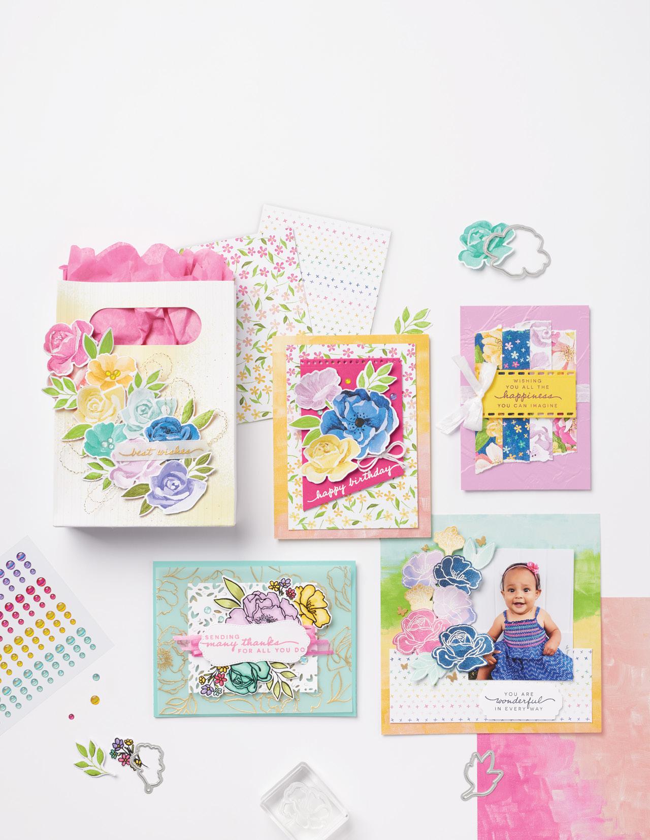 9 cling stamps (suggested clear blocks: c, d, e) Coordinates with Painted Labels Dies (p. 172)