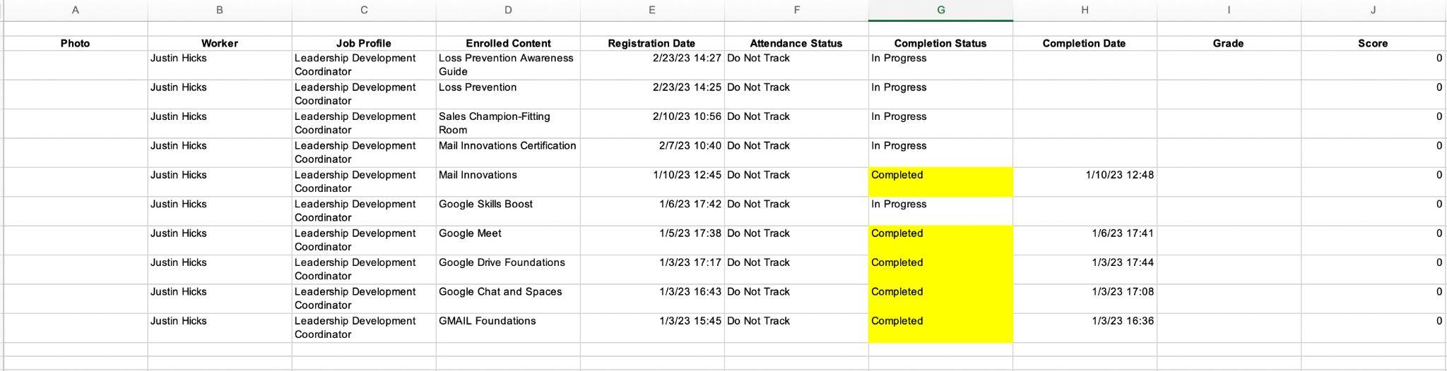 THE SPREADSHEET WILL SHOW YOUR ENTIRE TEAM AND THEIR LEARNINGS BASED ON DIFFERENT PROGRESS LEVELS: