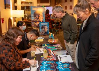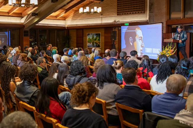 1. Matt Snipp speaking with Tommy Orange 2. Kieve Lecture audience listening to Orange 3. Annie Atura, Tommy Orange, Paula Moya, Ramón Saldívar 4. Loren Kieve 5. Kieve Lecture sign-in table 6. Chris Clarke, Gina Hernandez-Clarke, Sterling HolyWhiteMountain 7. Sheela Subramanian, Anne Kieve