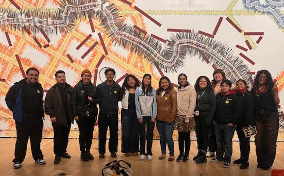 In fall 2024, Dr. Magie Ramírez, Associate Director of Chicana/o-Latina/o Studies, and 11 undergraduates ventured to the Oakland Museum of California to view the exhibition Calli: The Art of Xicanx Peoples. Curator Gilda Posada gave the group a private tour of the exhibition, recounting the histories behind the pieces as well as their curatorial vision for the exhibit. Students connected the pieces with the texts they were reading in class, learning about the many forms of cultural production that Latinx communities create, as well as the histories of Chicana/o arts movements in the US.