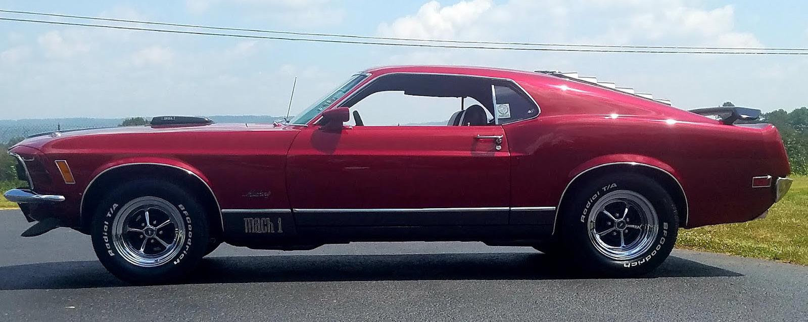 My first car came when I graduated high school in 1973. It was a 1961 Mach 1 Mustang. It had 351W and was Maroon, and automatic, but it was totaled in early ‘82. Years later, I got the itch again for another Mustang. I searched the internet, locally and far. Sometimes too far. One Sunday night my best friend called and told me of a 1970 Mach 1 on Ebay. The car was in Bowling Green, Kentucky. I called the gentleman at S&S Automotive and we made arrangements to see the car. I was amazed to see the Mach 1 was the color I intended to paint whichever car I found. Candy Red, beautiful, we agreed on the price and away we went. Since I purchased the car, I have added all new chrome, interior console, fold down rear seat, power front disc brakes, rewired the engine compartment, all new suspen -
