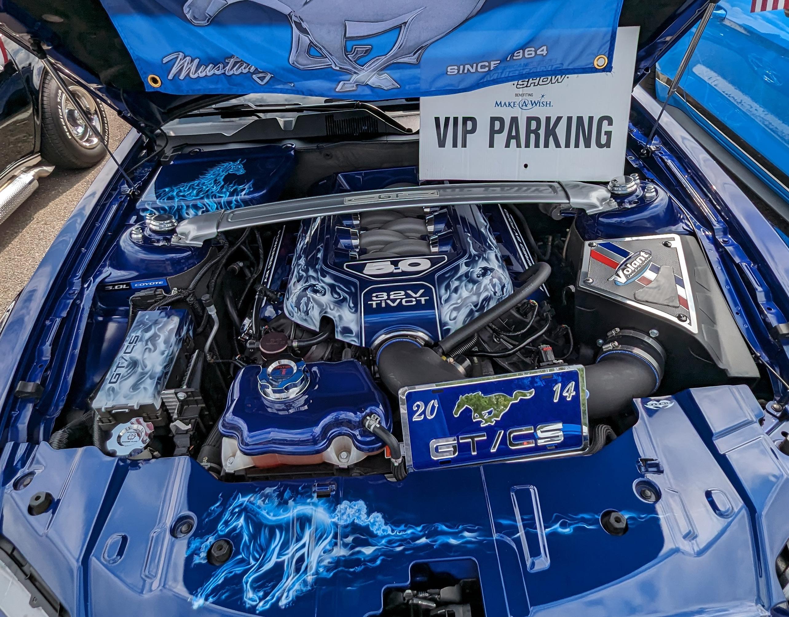 In January 2014, I saw this car at the dealership and then fell in love with it immediately. From the beautiful Deep Impact Blue color, to the rare glass roof, I couldn’t help but to then start my mods. I had my engine bay airbrushed and SMKNPONY was born. I also added the Roush exhaust, Volant Cai, Saleen wheels, and a few other little things.