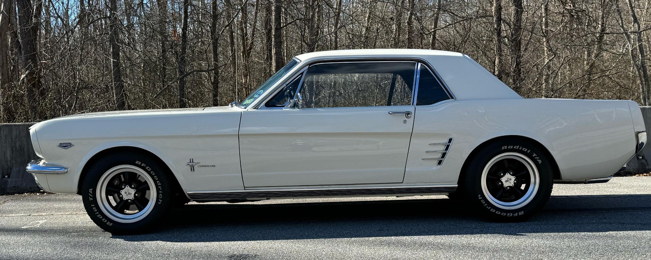 This is my 1966 Ford Mustang Hi Po coupe nicknamed “The White Knight.” Mods include front disk brakes and a five speed transmission.