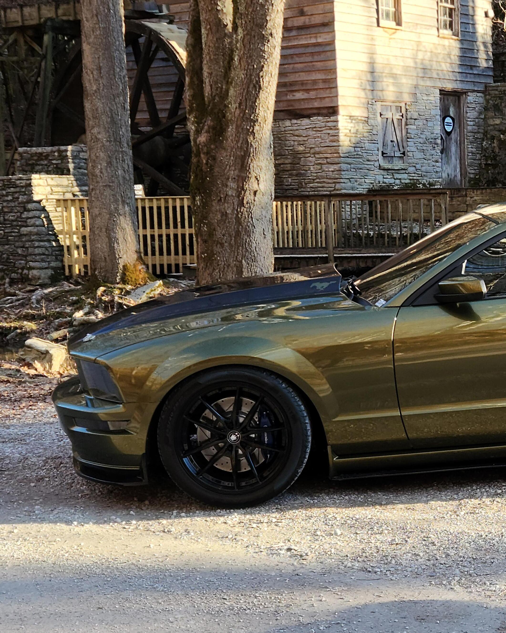 Since my purchase of my car I have added several performance mods which include, Howards rattler cams, JBA long tube headers, JLT cold air intake, 4.10 gears, Hurst short throw shifter, Lito tune, Borla exhaust, 62 mm throttle body, Eibach sportline springs, and a Exedy clutch. I’ve done alot of work to make the car one of a kind including a carbon fiber hood, carbon fiber duck tail spoiler, Raxiam tail lights, 66 Polar Customs rear diffuser, side splitters, front lip, bullitt grille, Konig wheels, and a full custom paint job done in Harley Davidson Olive Gold with PPG paints.