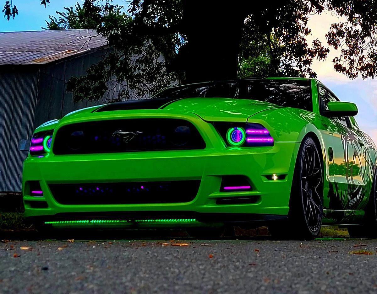 Mods include cold air intake, engine covers, new wheels from American Muscle, Boyd Racing spoiler, back panel, 2013 tail light mods for 07 Mustang, Flowmaster exhaust, lowered suspension, new shocks, new brakes with covers, Mustang wheel knockoffs, chrome grille, new headlights, yellow fog lights, repainted to its original color (Vista Blue), and custom pin striped. We had the GT/CS stripe removed because of it being damaged and then pin striped a custom one on it. No work done on the interior yet besides a touch screen radio, LED footwells, and LED dashboard.