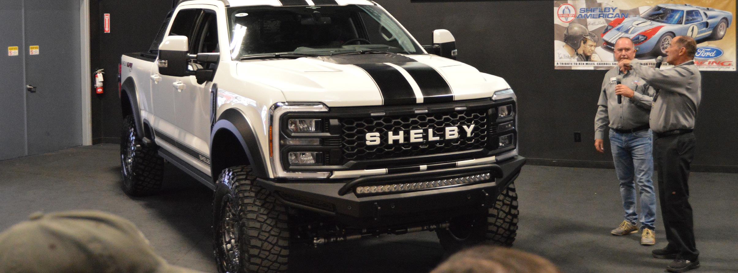 Wednesday, November 1, 2023 was this year’s Shelby SEMA party, held at the Shelby American headquarters in Las Vegas. It was a very short presentation this year and more of a mingling type event. Just some rubbing shoulders with the people who make Shelby what it is today. Everyone was talking about what could be under the black fabric cover. We could all tell it was a truck. A beefy, lifted truck even. At 8:40 pm the wait was over as Vince LaViolette (Vice President) and Gary Patterson (President) pulled back the cover to reveal the 2024 Shelby F-250 Super Baja. They take the base Lariat Ultimate 4x4 Ford Super Duty and created this beast.