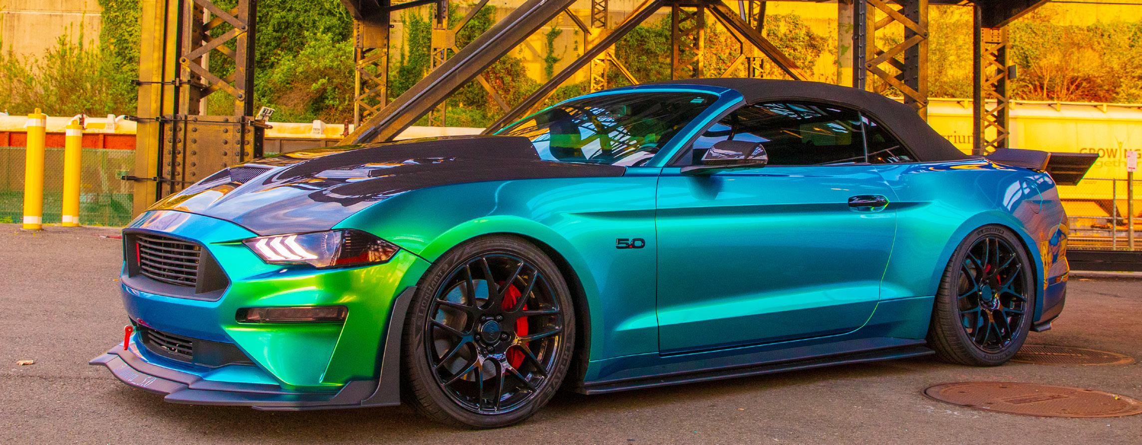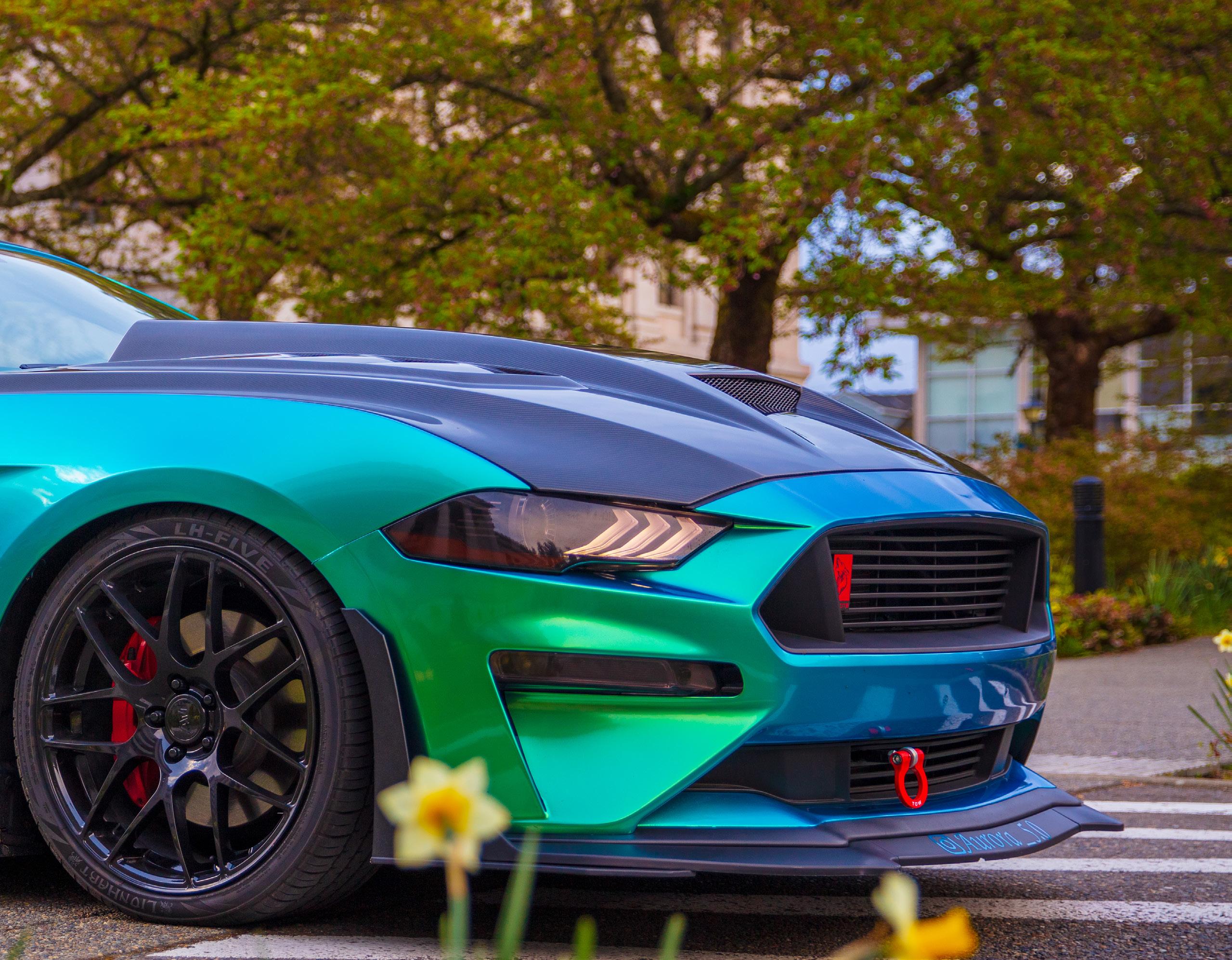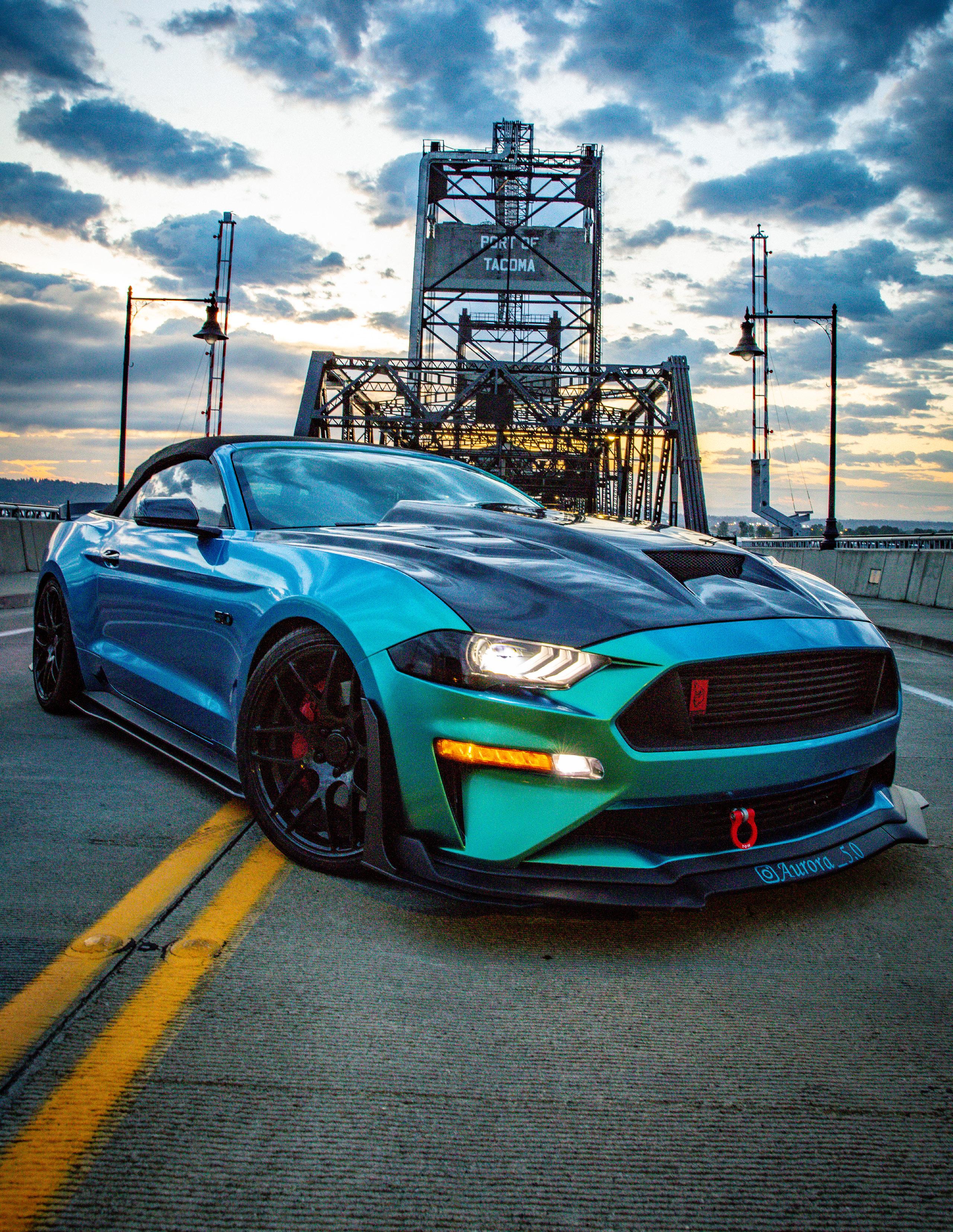 Aurora’s upgrades include carbon fiber Terminator hood, carbon fiber side mirror covers, GT500 style fender extensions, tow hook, Coyote badge, Drake Muscle Cars rear diffuser, Drake Muscle Cars wicker bill rear spoiler, MMD grille, Eibach Sportline lowering springs, 20’’ AMR Gloss Black wheels, Drake Muscle Cars side rocker splitters, Drake Muscle Cars rear side splitters, and Black fender badge.