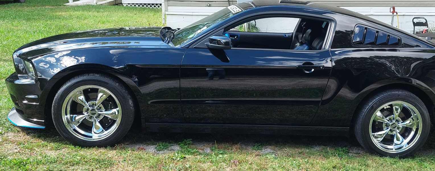 This is the Black Knight, my 2013 Coyote Cyclone V6 Mustang. I bought this car in 2021 in Tampa Bay, Florida. When I looked at this Mustang the engine bay and engine and interior was really clean. The paint needed some work. In August of 2021, I had the Black Knight painted. It was the painter that called it the Black Knight and it stuck. After painting, I had a 6 year ceramic coating put on. The engine I put engine bay lights from Oracle. The cold air induction from Airaid. The MDM battery and master brake cover I put the Tri Bar Pony on them. I put the Tri Bar Pony wall mount plaque on the hood insulation liner. I have the GT500 front splitter and GT500 spoiler. The interior I put custom made seat covers from Seat Covers Unlimited. I installed the carbon fiber interior kit. I installed the Hurst Pistol Grip shifter. I also have American Muscle Racing deep dish chrome wheels with high performance tires. All my modifications have come from American Muscle.