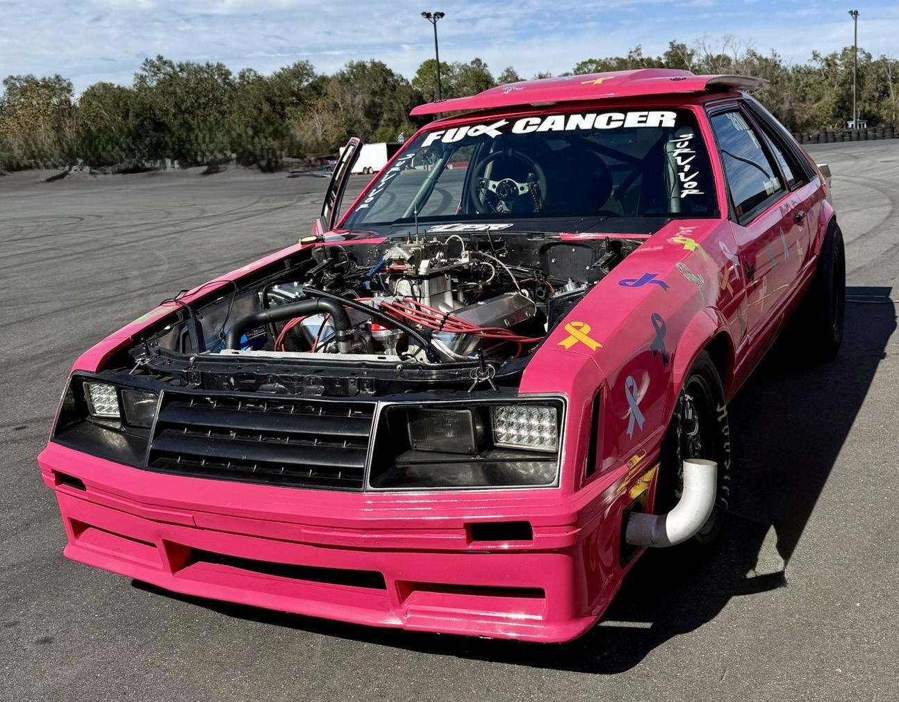 The Hot Pink “Survivor” car isn’t built to blend in and it isn’t meant to. It’s a 1986 Ford Mustang running a 408 Windsor small-block V8, owned by Chris Dorsey and Daniel Thomas of D&T Racing, and it carries a message that goes far beyond the starting line.