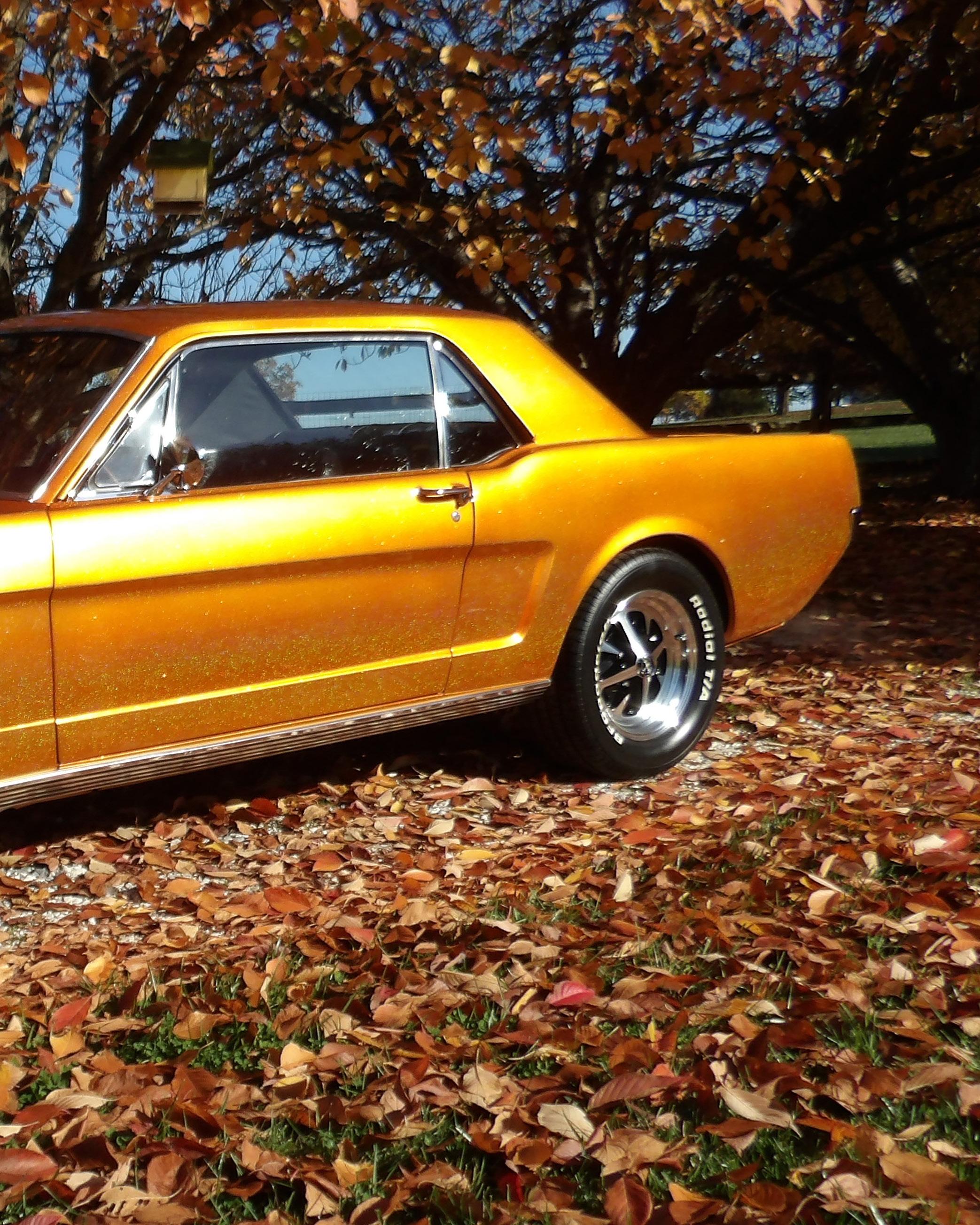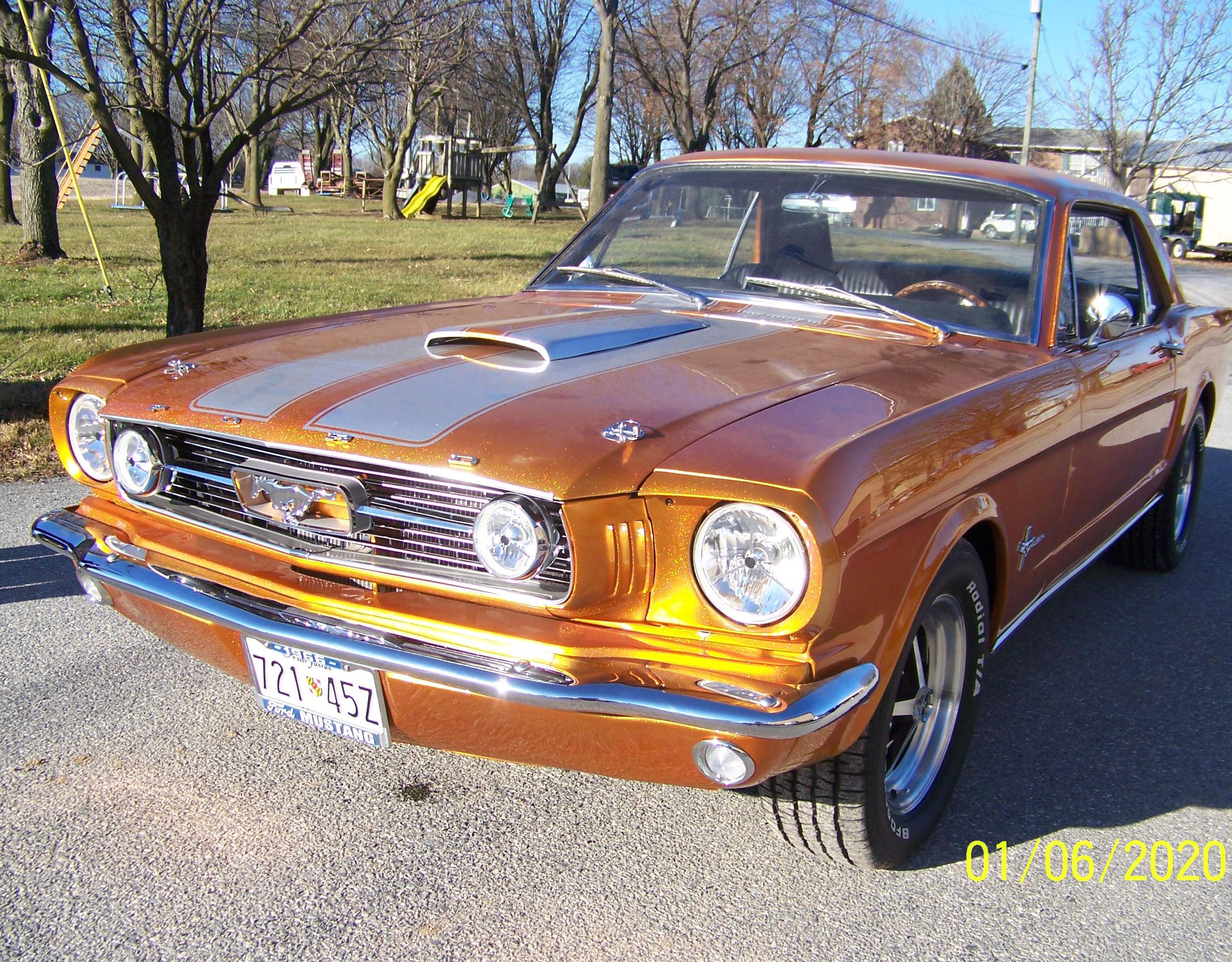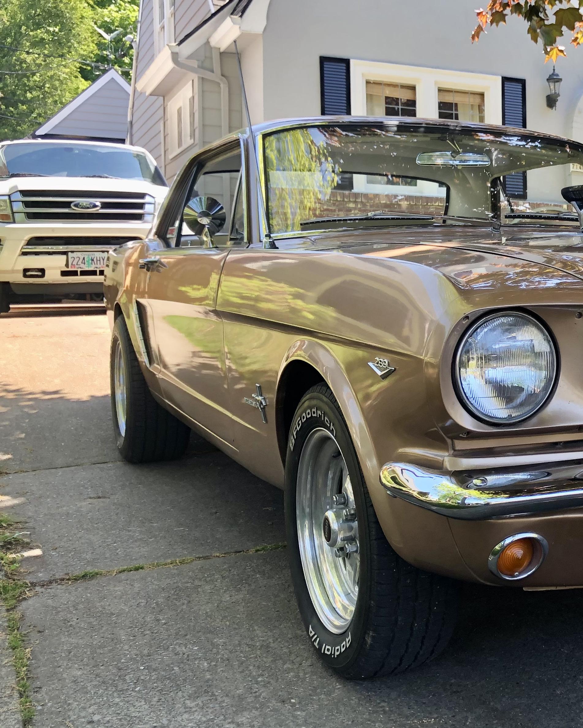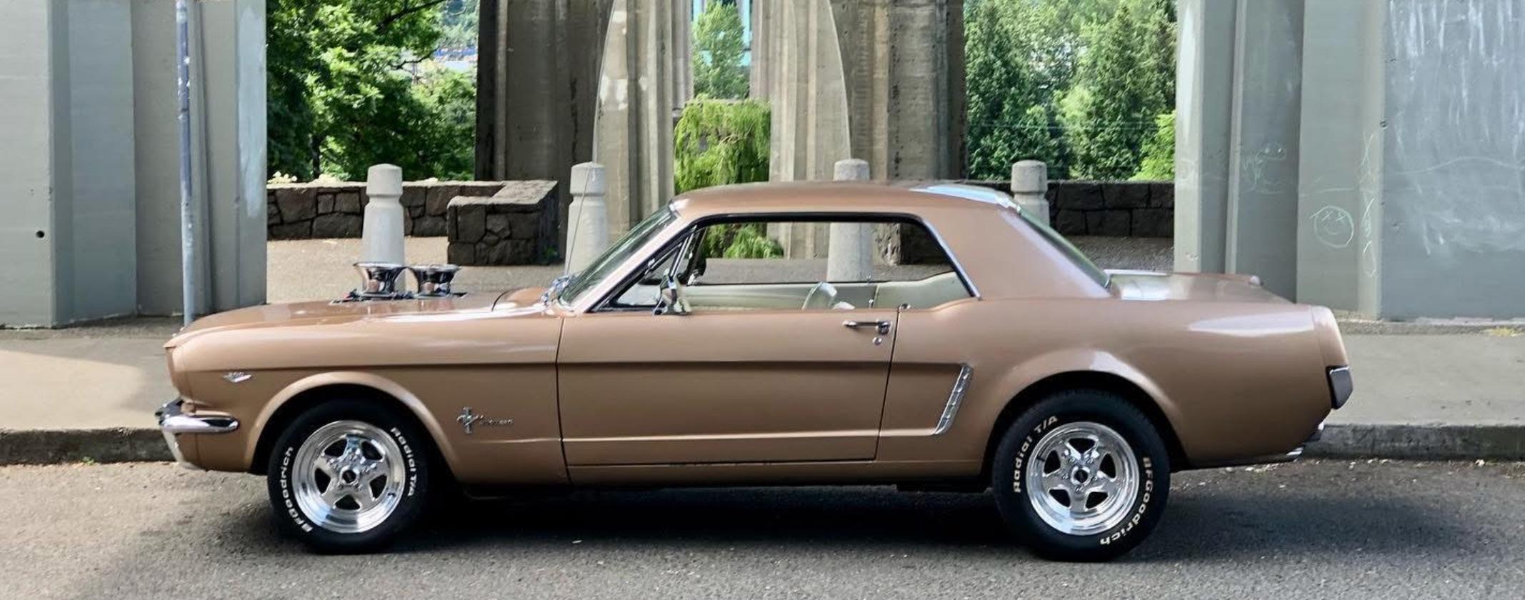 My name is Todd Bruce and I am from Portland, Oregon. This is my 1965 Mustang Coupe in the color Prairie Bronze. It has a 289 bored .030 over with 10 thousandths shaved off the deck, Currie 9” rear end with 3”x12” F-150 rear drums with Kelsey Hayes disc brake calipers up front with a Line Lock, HD 5 leaf rear springs KYB gas adjust shocks, vacuum pump motor under hood for the power brakes and an ice can to cool the fuel with 6 feet of fuel line coiled in the cold can. It also has Tru Street Ram pot mod tunnel ram from Colorado Hot Rods chokeless carbs, Shift kit, deep pan Green Dot C-4 transmission, and makes 309 HP with 322 foot pounds of torque.