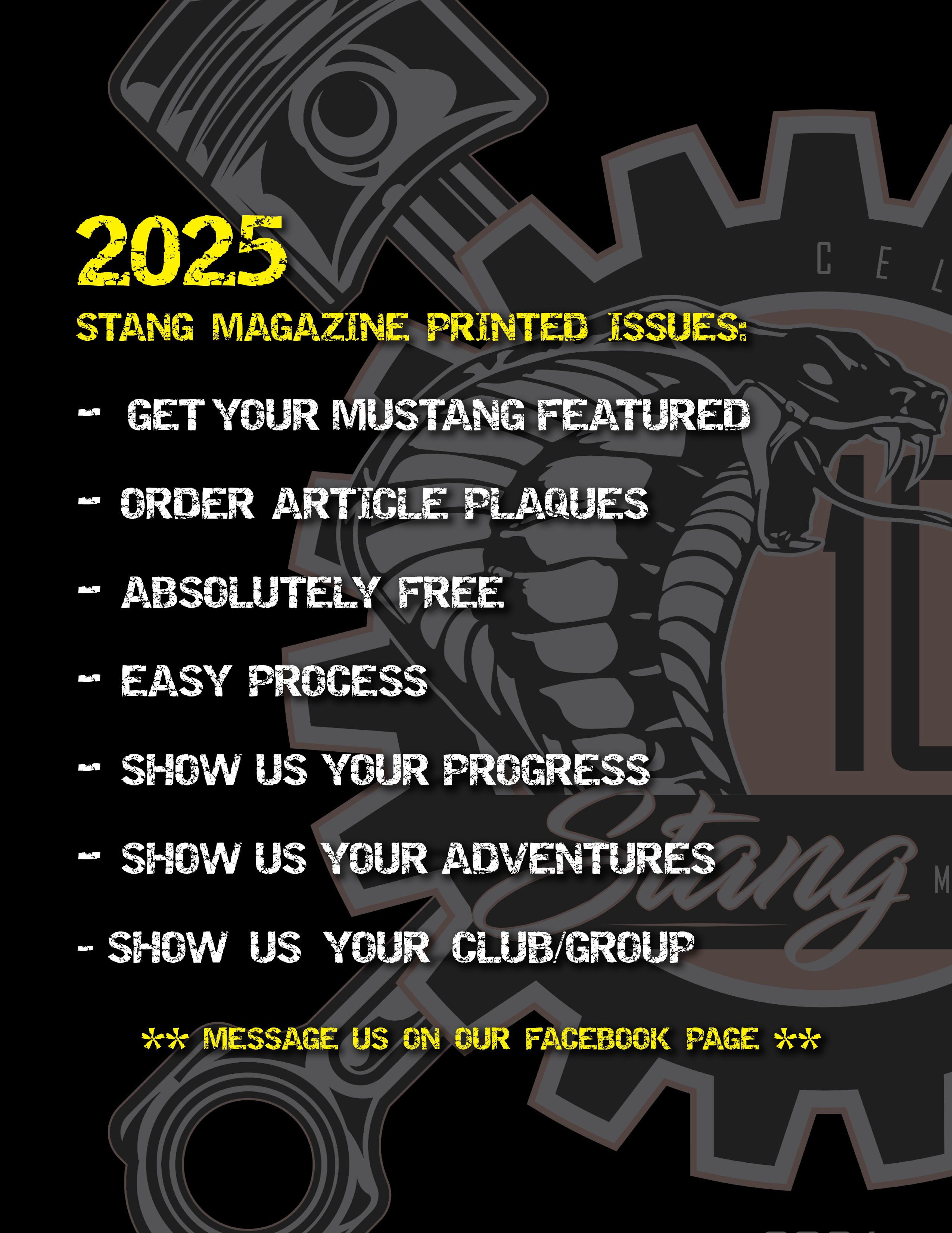 Mustang enthusiasts have asked for a magazine that has no ads, no sales pitches, and no bogus “fillers” to eat up space. They have asked for a magazine that is free, easy to access, and nothing but focused on Mustang pictures and content. They have asked for a magazine produced and written by Mustang owners. They have asked for a magazine that highlights the daily drivers and the average Mustang that is driven and is not a trailer queen. They have asked for the chance to one day have their ride, their group, their club, or their cause to be recognized in print or online. It is our absolute pleasure to meet these standards and to give you STANG Magazine. We hope that both our message and our image will be seen in every Mustang community out there. Thank you Mustang fans and enjoy your ride! -