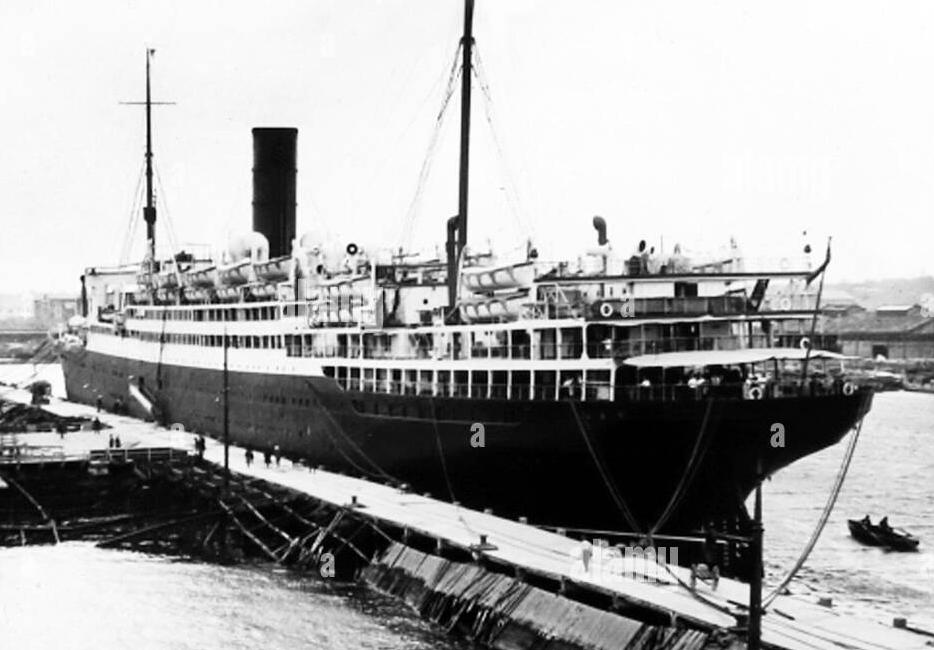 A “gigantic” ship labeled “H. M. S. Samaria. Liverpool”, and painted a drab battleship gray loomed up before us as we staggered up the gangplank to our quarters, loaded down with all our worldly possessions, and clutching the Hershey bar that the Red Cross ladies forced in our dank little paws. It was the biggest ship any of us had ever been on, including Pardridge, who had sailed many a schoo -