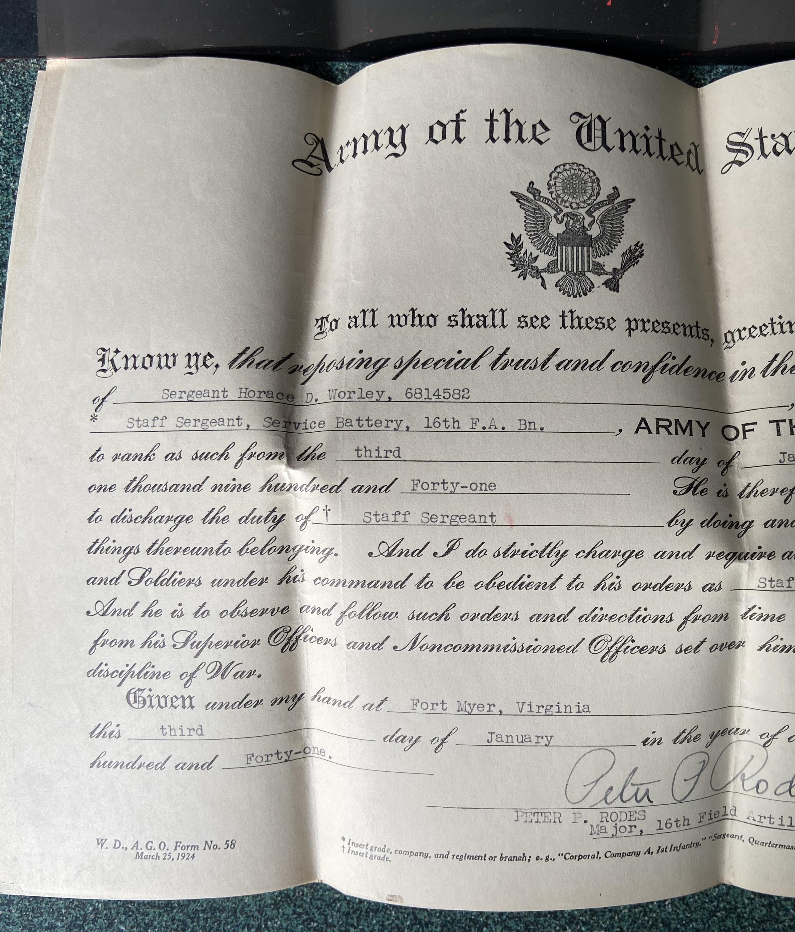 Let’s continue on with the adventure. Let me just tell you, fate will soon be knocking on the door. As I continued to dive into the documents, pictures, and everything that Doug gave me, I found that Doug’s grandfather, Horace D. Worley’s second enlistment started from 1934 - 1937 and he was assigned to the HQ Battery, 1st Battalion of the 16th Field Artillery. He was sent to Fort Myer, Virginia where he remained until 1937. During his third enlistment from 1937 - 1940 he remained with the 16th Field Artillery but my research indicates that his Battalion was moved to Norwood, New York just prior to the kick start of our involvement in World War II.