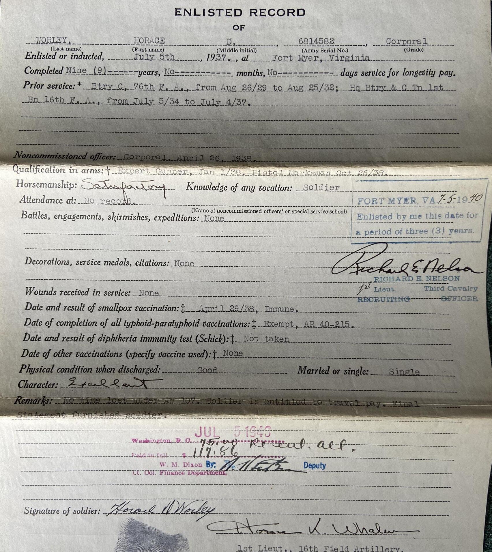 On August 24th, 1942, Horace D. Worley completed his term of enlistment and was honorably discharged from military service as a Master Sergeant with the Medical Department.