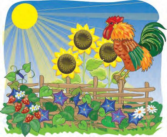 461. Погожий ранок, у синій безодні, миготливі зірочки, далекий обрій, яскра вим вогнем, рожева іскорка, червоний край, вогняного кола, ясне сонечко.