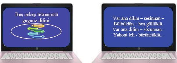 Yardım materialı. Unikal bir dil. Türk dillerin aylesinin bir azası. Türk dillerindä lafeder yakın 300 milion kişi bütün dünnedä. Gagauz dili pek yakın krım tatar, türk, azerbaycan, turkmen dillerinä. Bizim dedelerimizin dili, zengin istoriyasınnan. Sesli, şıralı hem melodiyalı. Onda yazılı gözäl peetlär hem türkülär. Genişleder bakışımızı dünneyä. Yardım eder saygıylan davranmaa insannara türlü milletlerdän hem devletlerdän. Zengin kulturanın bir önemni payı.