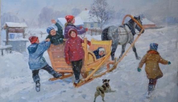 İnsannar sıcak kış rubalarına giiyimni. Ellerindä –eldivennär, bobadan kaarä, hepsinin başlarında var şapka. Hepsinin suratları şen hem kısmetli.