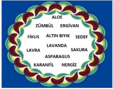 1. Karımcalık. 2. Süpürgä. 3. Hıyar. 4. Çarık. 5. Saat. 6. Kiyat hem bukvalar. 7. Kaar. 8. Karımcalık 9. Kalpak. 10. Dermen kanatları. 11. Karpuz. 12. Çilek. 13.Gölgä. 14. Beş şiş. 15 Yazı.
