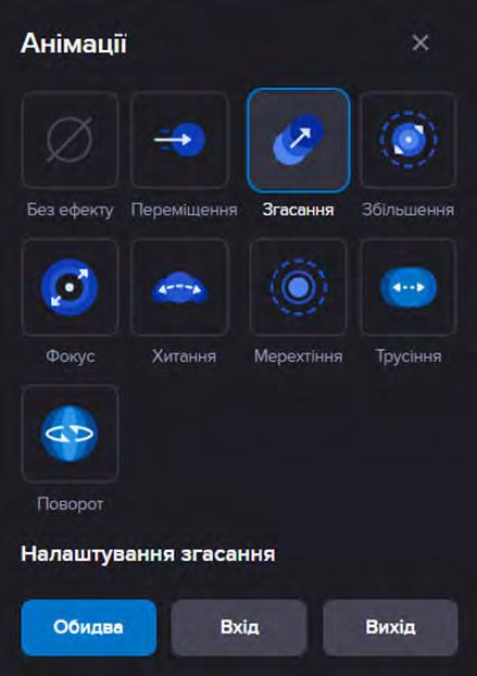 можна налаштувати час та вид анімації ( вхід або вихід).