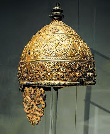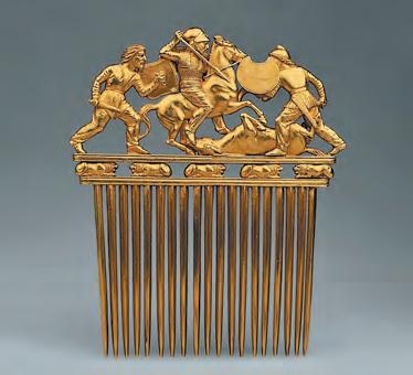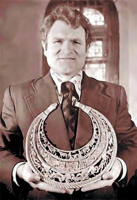 Український археолог Борис Мозолевський і знайдена ним у 1971 р. золота скіфська пектораль із кургану Товста могила.