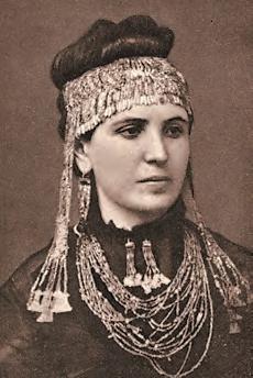 Софія Шліман — дружина дослідника Г. Шлімана в золотих прикрасах, що були знайдені під час розкопок
