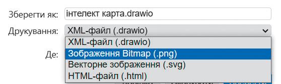 За замовчуванням створені файли зберігаються з розширенням .drawio, але команда Зберегти як допоможе обрати інший формат, наприклад png.