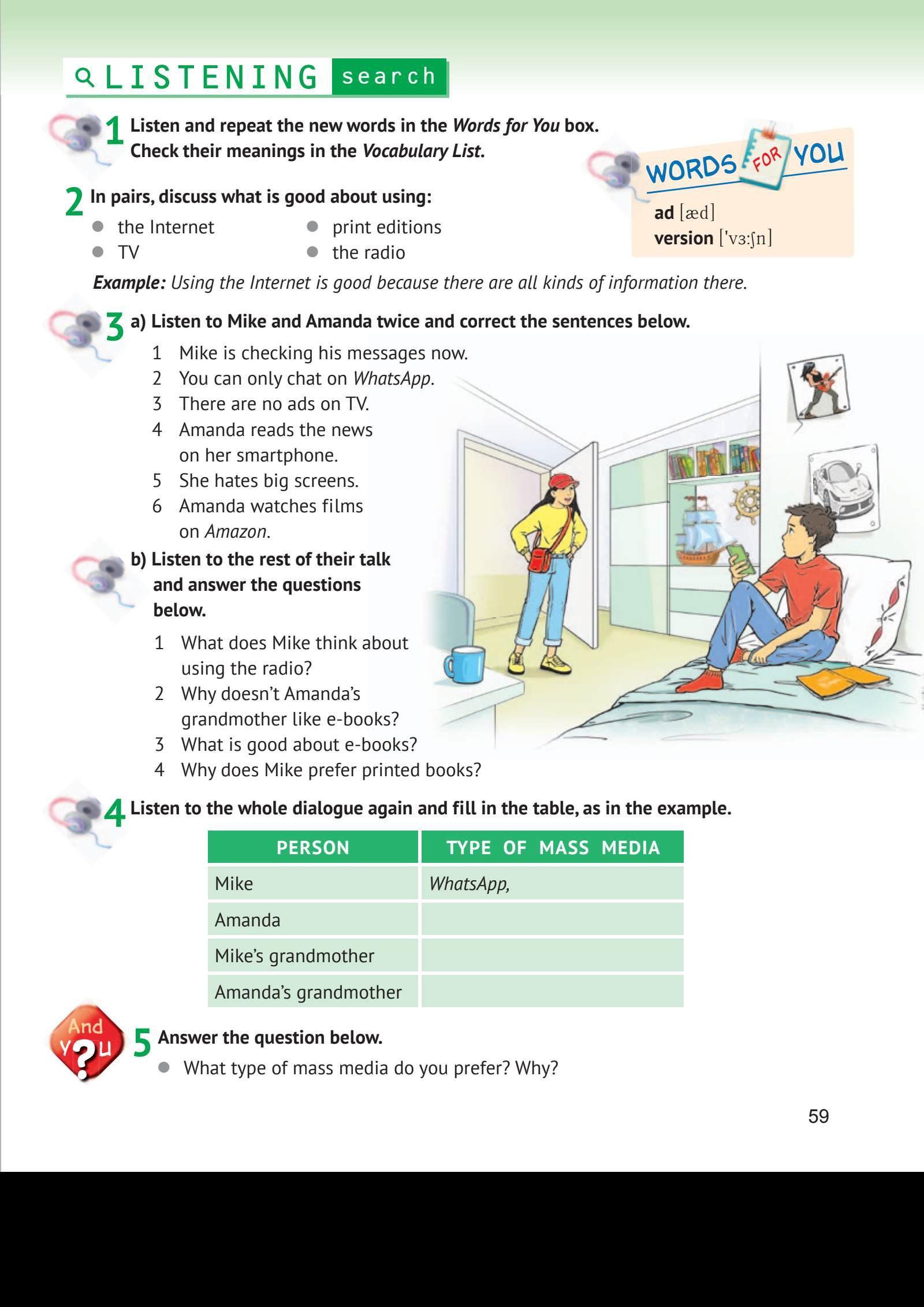 Asking and answering about the mass media in our lives. Discussing mass media types. Delivering a presentation about a famous blogger. Describing a website.
