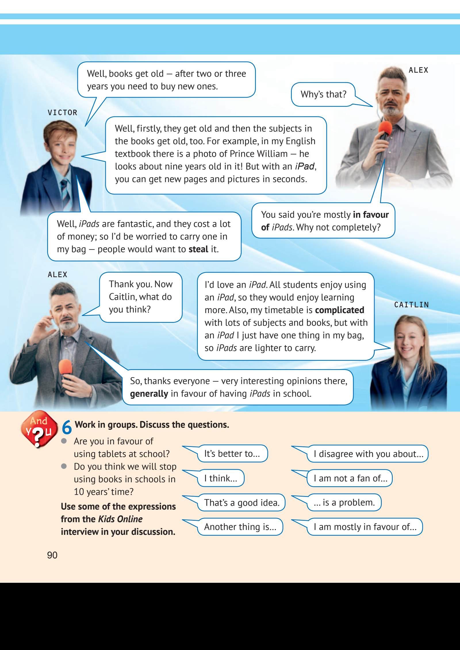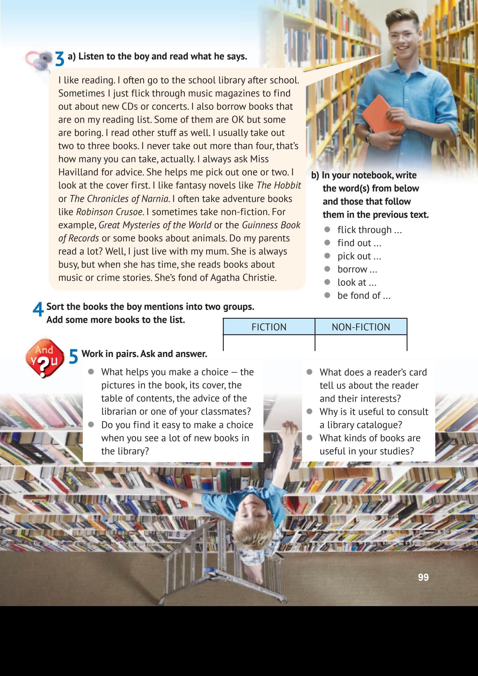 Discussing pros and cons of using tablets to read. Expressing an attitude to reading. Describing a book character. Giving advice on how to choose a book. Talking to a librarian.