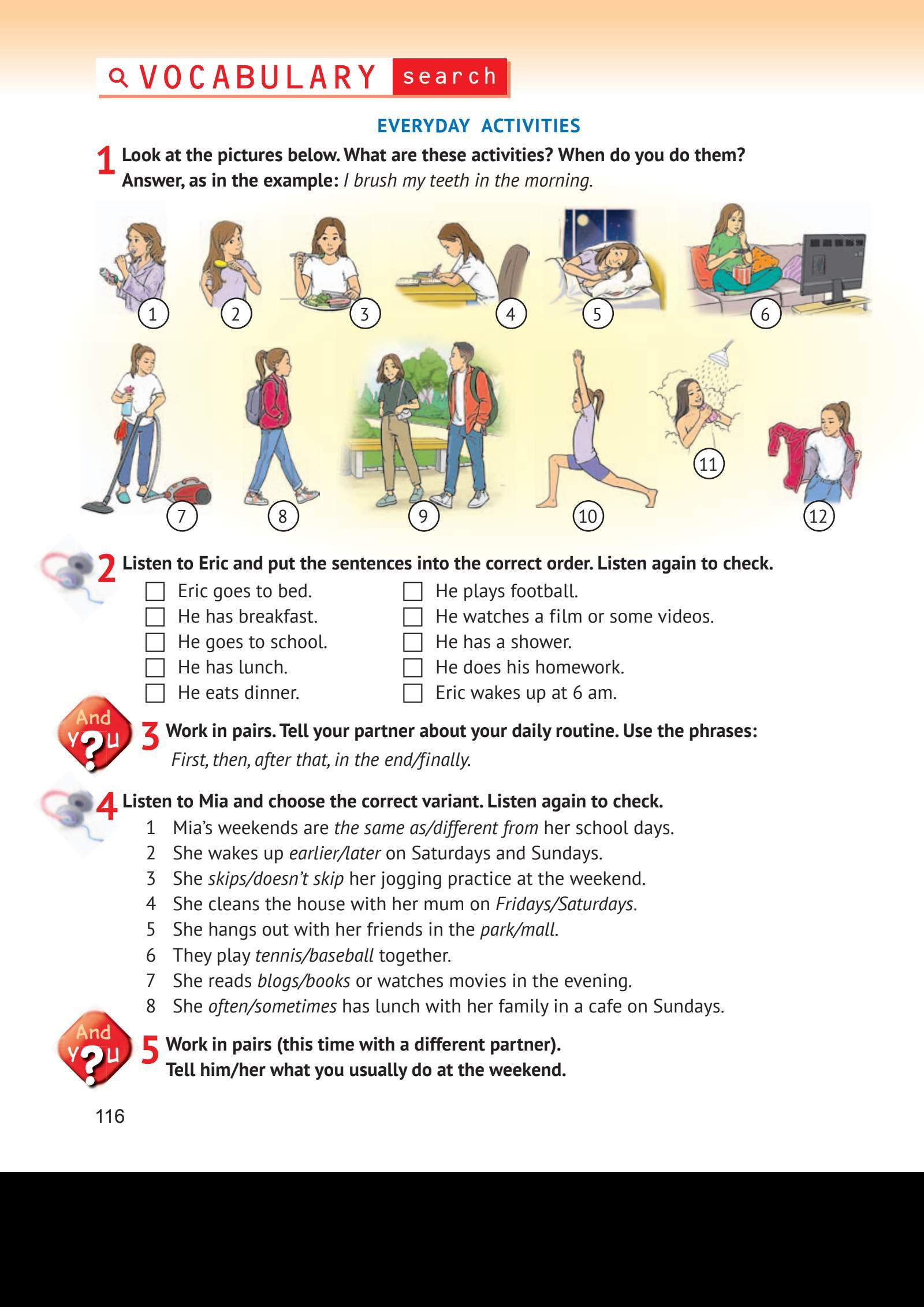 Sharing personal information about daily routine and spending free time. Conducting a survey and interviewing others about eating habits.