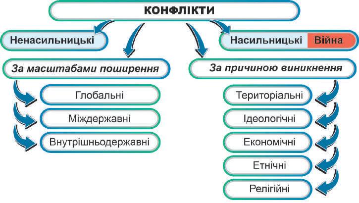 причиною виникнення конфлікти поділяють на територіальні, ідеологічні, економічні, етнічні та релігійні. Часто в основі конфлікту можуть бути декілька причин