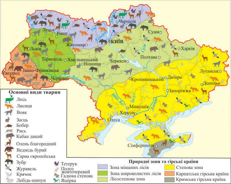 геологічну будову, кліматичні умови, моря, ріки й озера, ґрунти, рослинність і тваринний світ, ландшафти України та природні