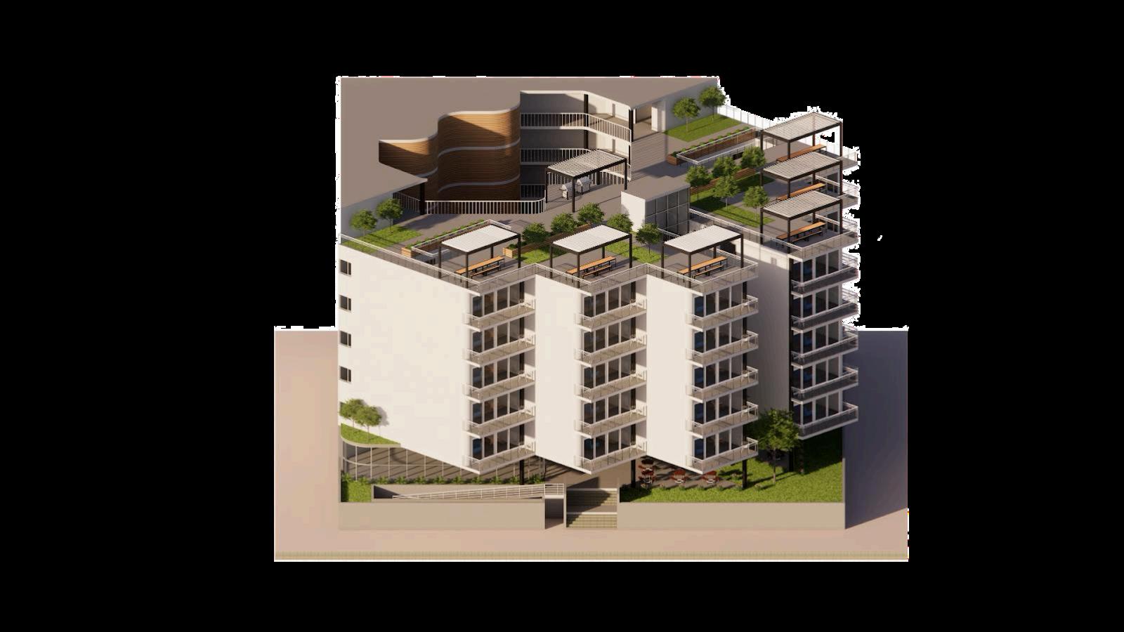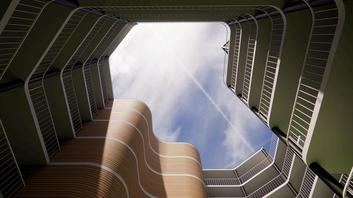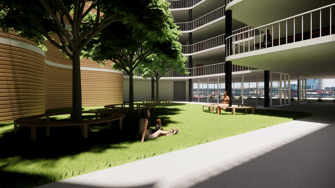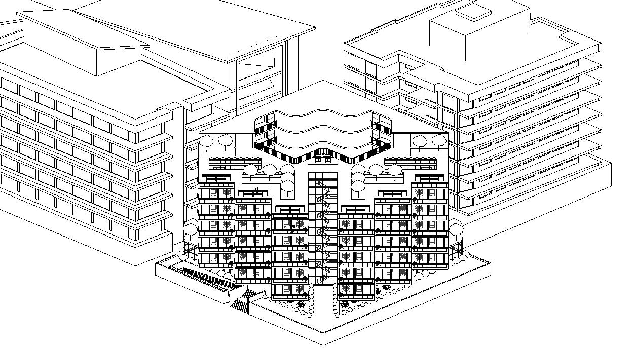 This project envisions a resilient, interconnected multi-residential community in Woolloongabba that operates as an extension of the adjacent social housing building. Through strategic north-west orientation toward the Gabba and Brisbane City, elevated floodresponsive design, and a central courtyard, the design prioritises environmental performance, wellbeing, and visual connectivity. Public, semi-public, and private realms are carefully layered to encourage interaction, while resident-led initiatives, such as bicycle refurbishment, creative studio exhibitions, and gardening workshops, generate income and activate shared spaces. Together, the two buildings form a cohesive urban network that redefines housing as productive, sustainable, and socially integrated.