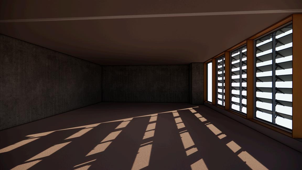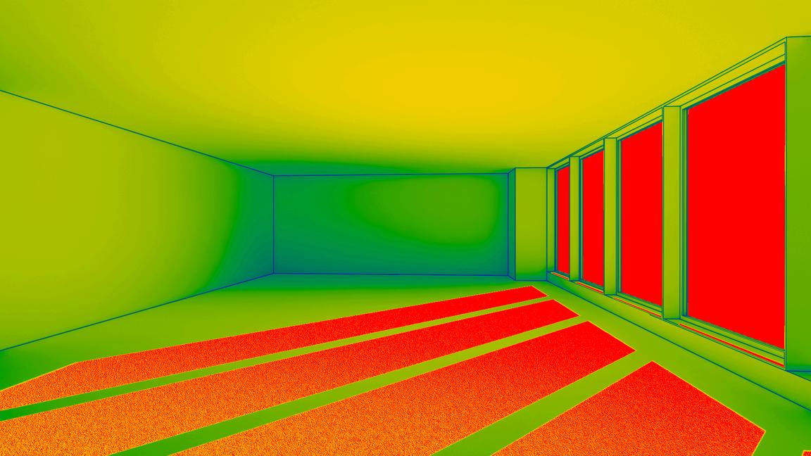 The daylight analysis evaluates the performance of the facade system with a focus on both visual comfort and solar control. Comparative renders illustrate how the Low-E glass slats modulate daylight penetration, reducing glare while maintaining consistent interior illumination. The infrared analysis further reinforces the impact of the slats on solar heat gain, demonstrating their effectiveness in controlling thermal load and enhancing occupant comfort. Together, these studies highlight how the structural design optimises daylight performance without compromising transparency, view, or environmental responsiveness.