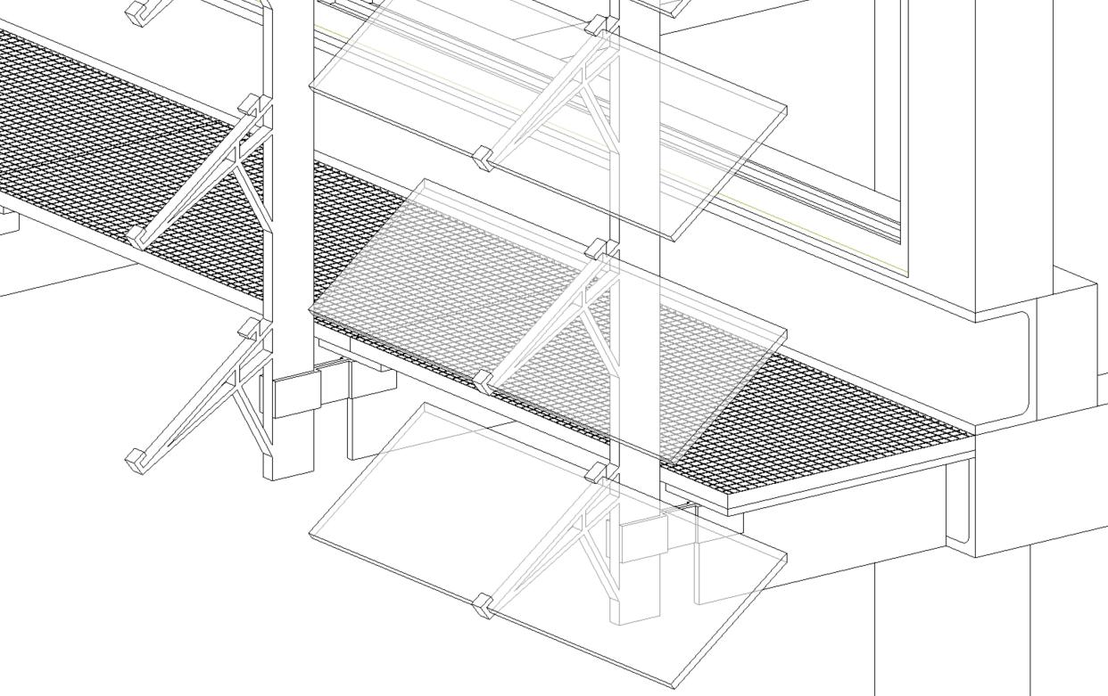 These construction details resolve the facade as a cohesive system where structure, fire safety and glazing work seamlessly together. Anchored back to the primary concrete frame, the assembly enhances visual comfort and environmental performance while maintaining clear constructability. Fire safety is integral to the design, with built-in separation measures that strengthen compliance and protect occupants without compromising the architectural intent.