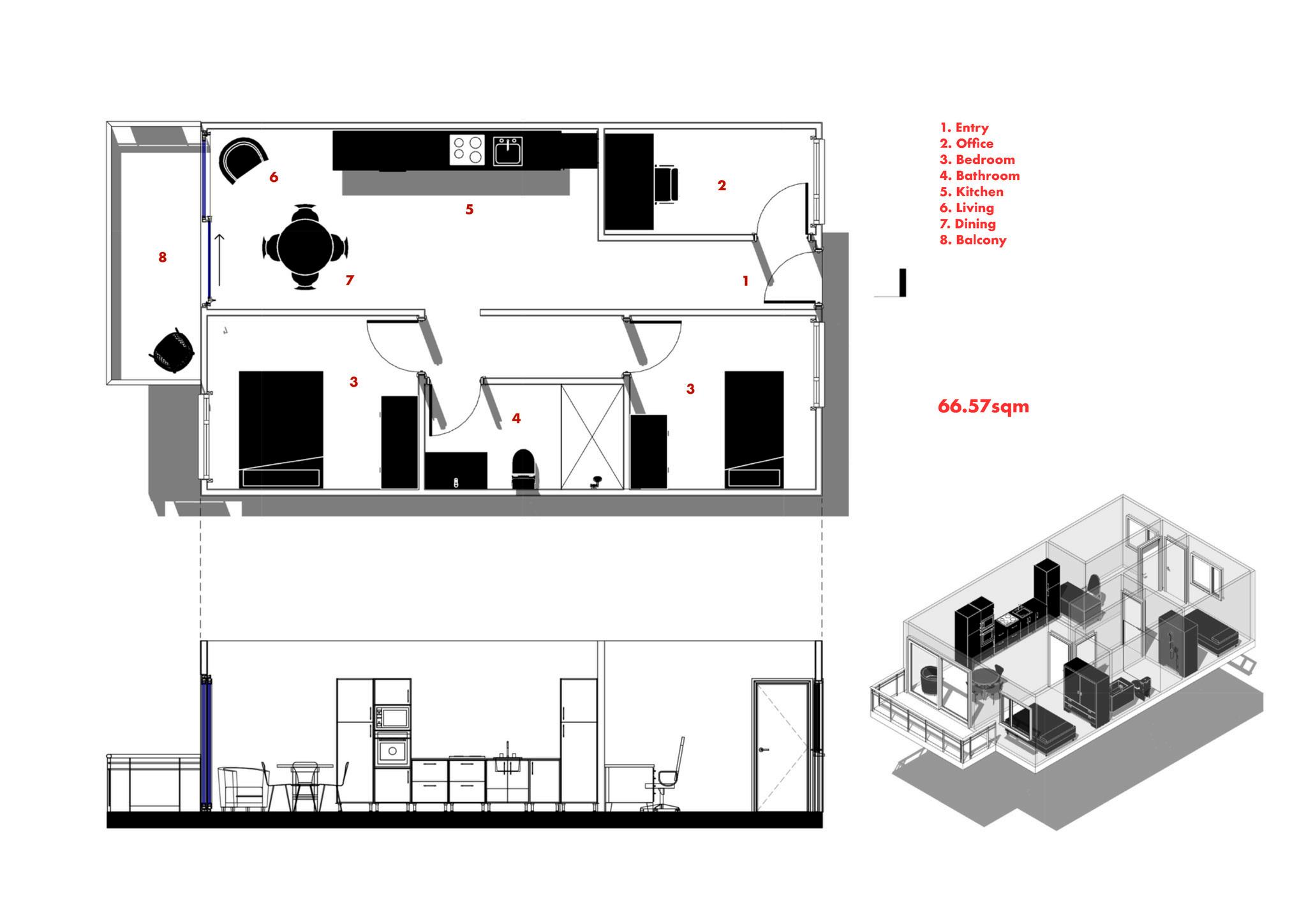 The unit analysis investigates how each dwelling responds to the specific needs, family structures, and working patterns of its resident. Rather than adopting a standardised apartment model, the units are differentiated in size, spatial hierarchy, and program to accommodate single occupants, single parents with children, and couples Considerations such as integrated workspaces, child-friendly layouts, and varying bedroom numbers challenge conventional domestic typologies. This analysis allows residents to live and work in ways that meaningfully support both individual autonomy and collective engagement.