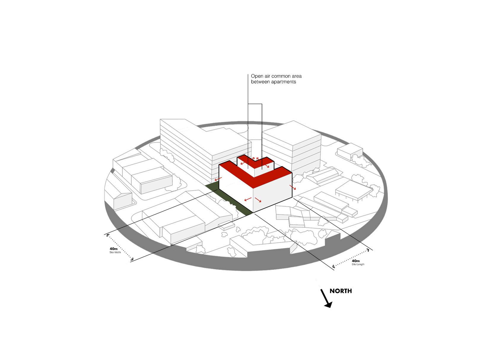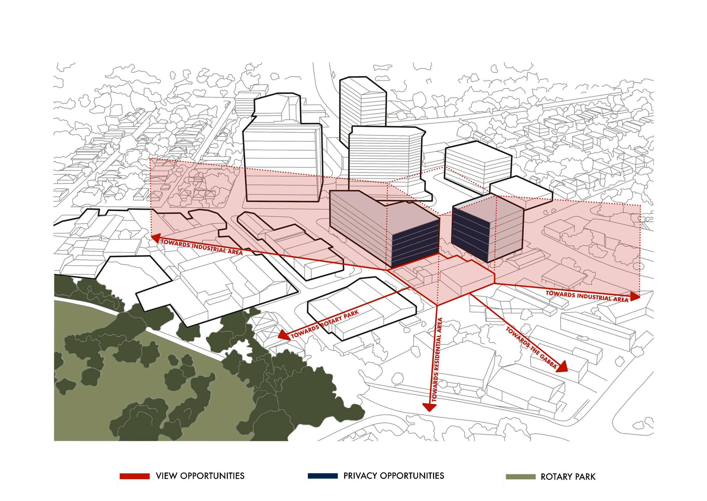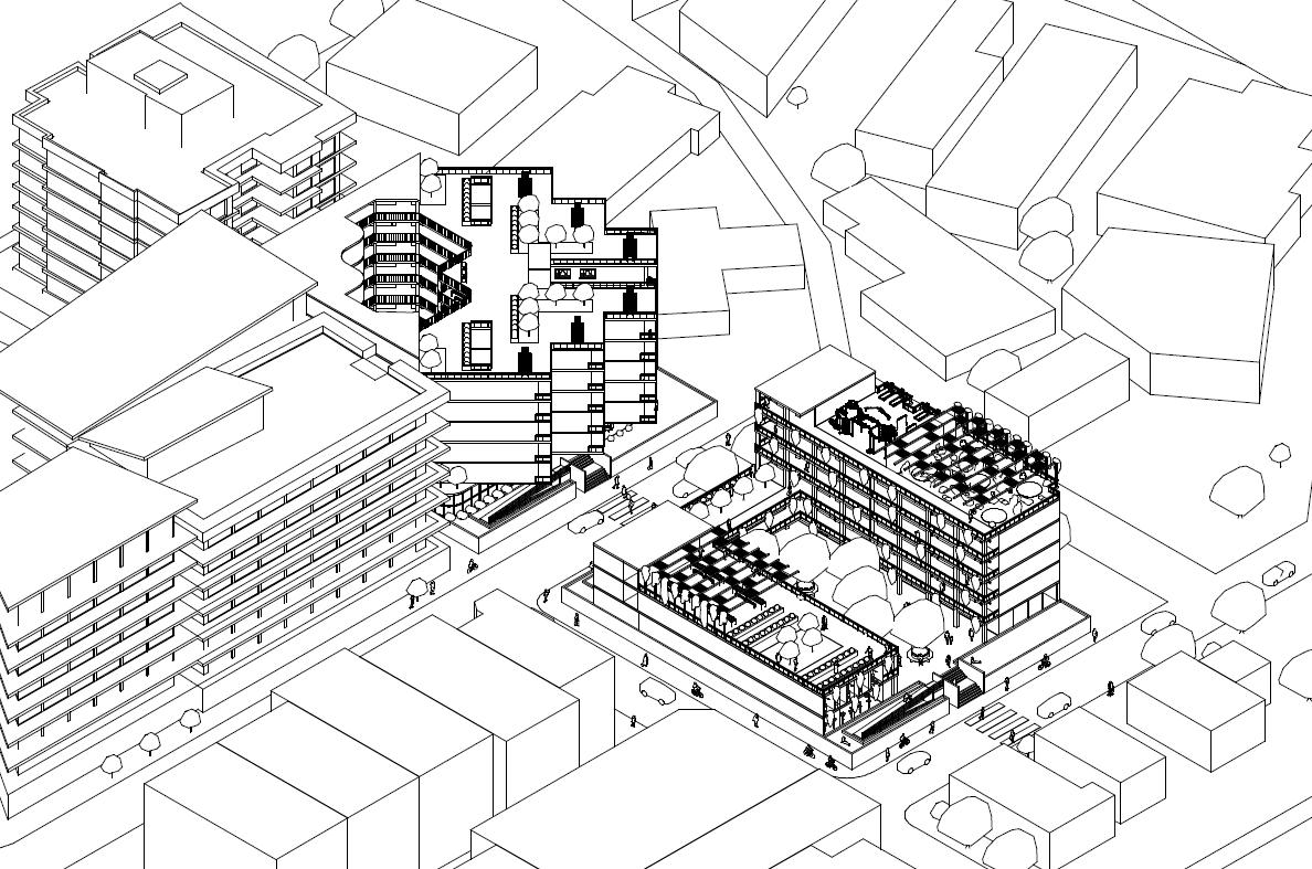 This project envisions a resilient, interconnected multi-residential community in Woolloongabba that operates as an extension of the adjacent social housing building. Through strategic north-west orientation toward the Gabba and Brisbane City, elevated floodresponsive design, and a central courtyard, the design prioritises environmental performance, wellbeing, and visual connectivity. Public, semi-public, and private realms are carefully layered to encourage interaction, while resident-led initiatives, such as bicycle refurbishment, creative studio exhibitions, and gardening workshops, generate income and activate shared spaces. Together, the two buildings form a cohesive urban network that redefines housing as productive, sustainable, and socially integrated.