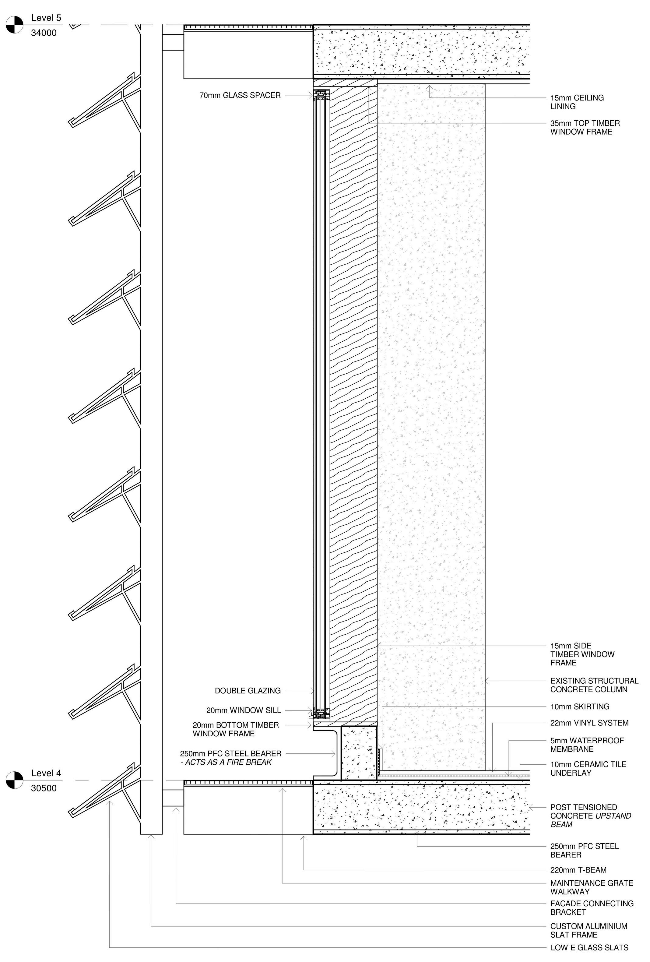 These construction details resolve the facade as a cohesive system where structure, fire safety and glazing work seamlessly together. Anchored back to the primary concrete beam, the assembly enhances visual comfort and environmental performance while maintaining clear constructability. Fire safety is integral to the design, with built-in separation measures that strengthen compliance and protect occupants without compromising the architectural intent.