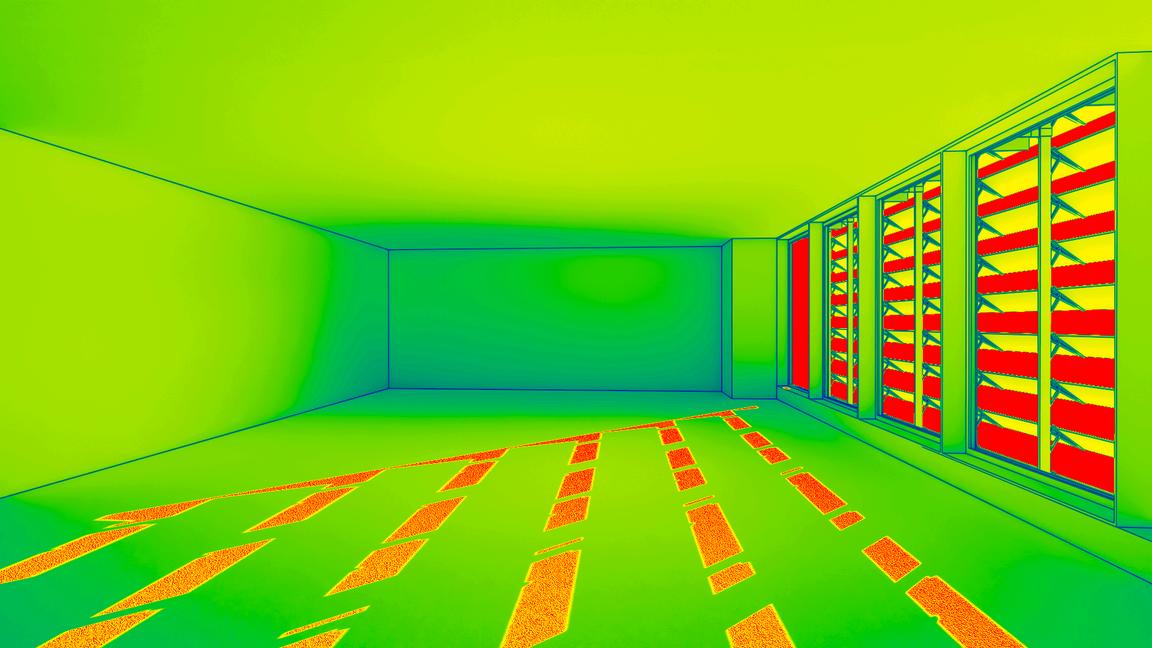 The daylight analysis evaluates the performance of the facade system with a focus on both visual comfort and solar control. Comparative renders illustrate how the Low-E glass slats modulate daylight penetration, reducing glare while maintaining consistent interior illumination. The infrared analysis further reinforces the impact of the slats on solar heat gain, demonstrating their effectiveness in controlling thermal load and enhancing occupant comfort. Together, these studies highlight how the structural design optimises daylight performance without compromising transparency, view, or environmental responsiveness.