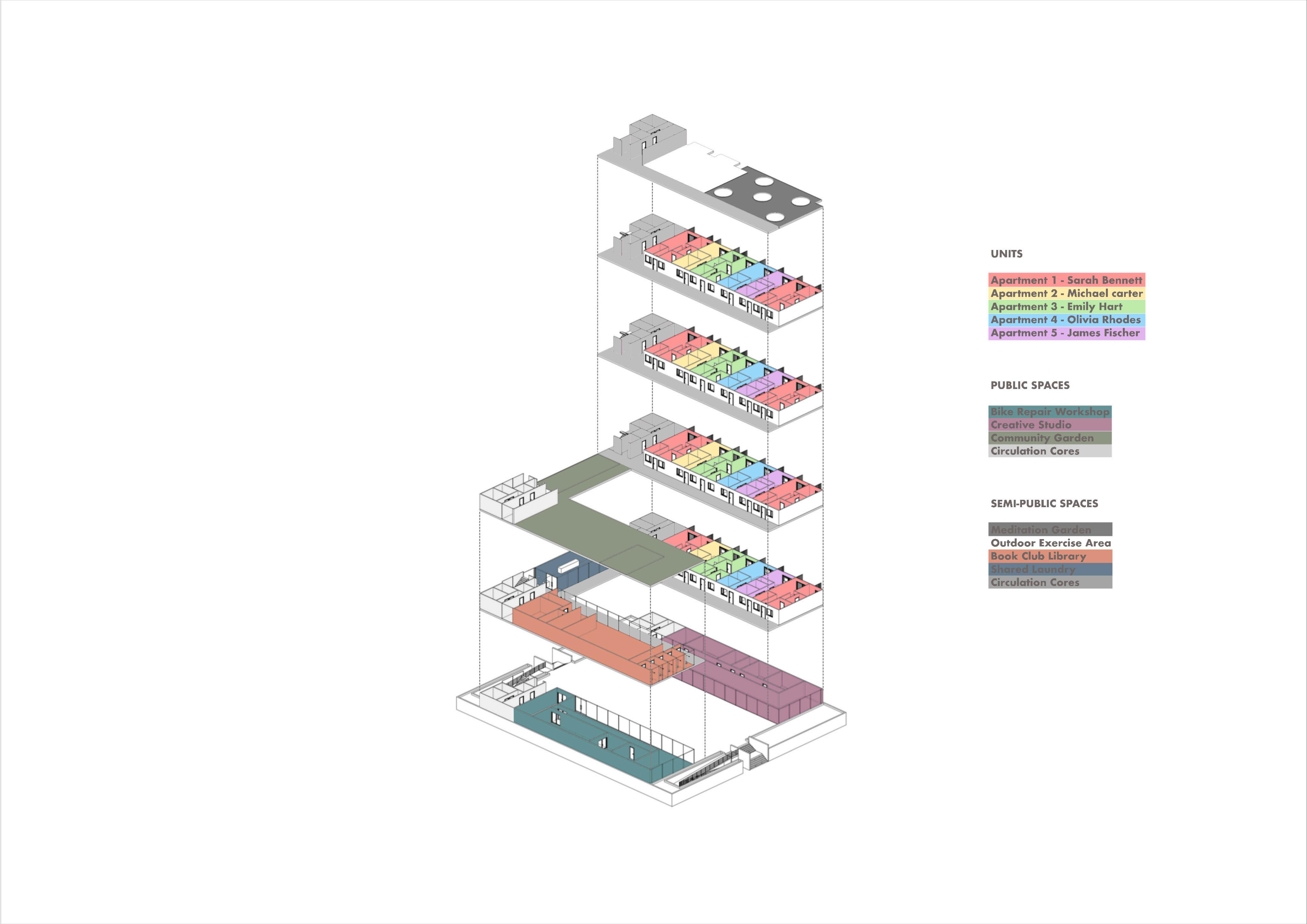 Vista Collective is shaped by a diverse group of residents whose occupations, family structures, and personal interests directly inform the spatial organisation of the building. Rather than designing generic apartments, each dwelling is driven by specific personal and professional needs, while shared semipublic and public spaces emerge from the collective skills and ambitions of the community. This approach challenges conventional housing models by linking private life with productivity, collaboration, and income generation. The occupants therefore act as a conceptual framework for aggregation, ensuring the architecture supports both individual autonomy and a cohesive, self-sustaining community.