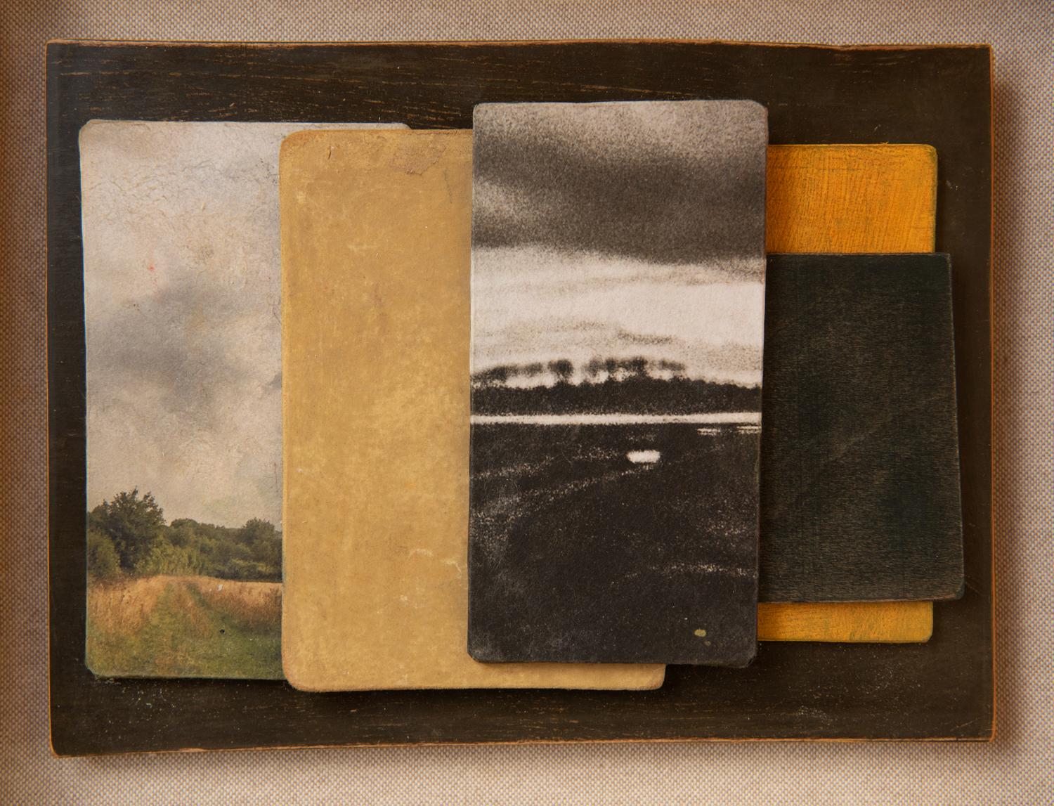 The line drawings led to a new area of abstract painting and relief work, all captured under the collective title Vision of an Estuary This multi-disciplinary project includes four bespoke artist books, where photographs and watercolours are placed side by side. ‘It's a development of the same idea’ Harry explains, ‘but rather than a line, I’m now playing with blocks of colour and moving them around.The paintings give you a fleeting glimpse of a landscape; something green and upright might suggest a tree, something blue might signify water or sky, but they are all motifs of a landscape I put them together and confuse them a little; I’m interested in the territory of the unknown.The pairings of the paintings and the photographs in the book are intuitive; they are not supposed to be connected, but they illuminate each other in some fundamental way Humans are programmed to make connections and so we find parallels even if they aren’t really there. We make our own pathways’.