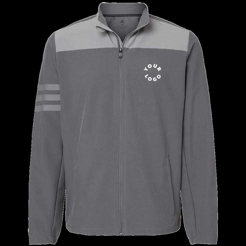 94/6 recycled polyester/elastane plain weave, Durable water-repellent finish, Soft shell stretch fabric, Half elastic cuffs, Two front zip pockets, 3-stripes on right arm, Contrast color adidas performance logo on back neck