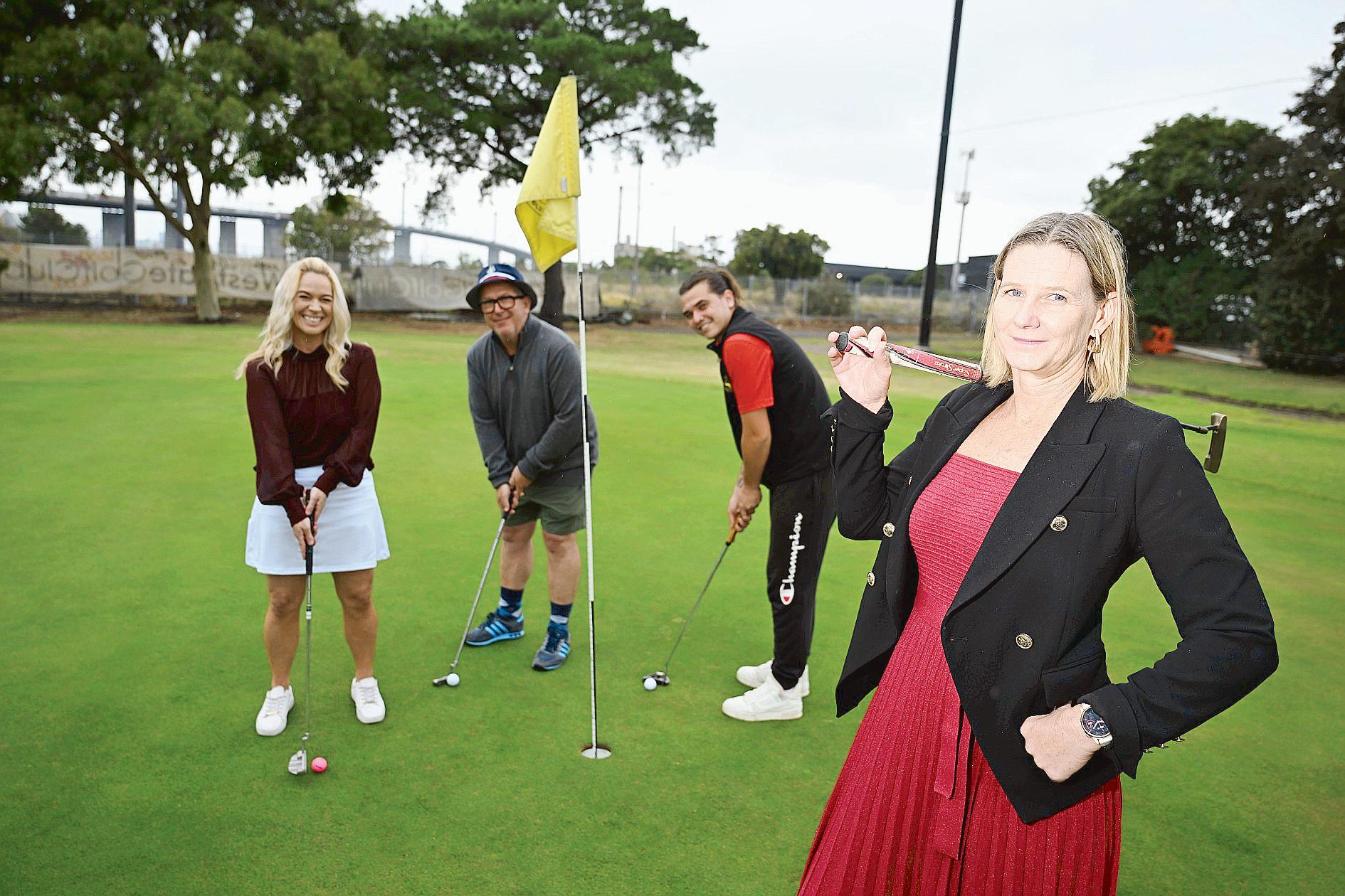 Organiser of the Safe Steps on the Green Charity Golf Day on 28 March, Amanda Thompson (front) practises her putting with MC Ellen Smith, Andy Smith from Vic Hotel Footscray, and Isiah ‘Izzy’ Kumar from the Westgate Golf Club. (Damjan Janevski) 540451_02