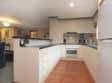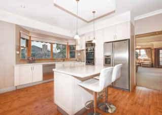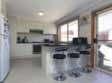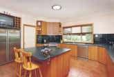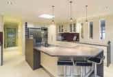 Caesarstone-topped breakfast bench and white appliances. The adjoining meals area has a wall display unit to show off collectibles, and richly grained timber wall panelling.