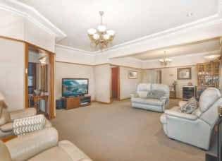 The entry hall opens to a large, elegant lounge room with a bar, making it a fine adult retreat space in which to entertain friends. Next door, through an archway, is a dining room with built-in buffets and windows capturing a leafy outlook.