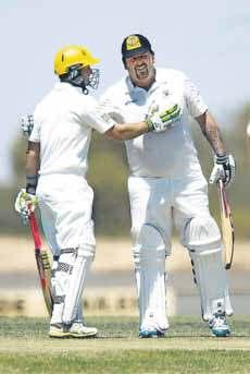 Super knock: Werribee captain Shaun Dean congratulates opener David Wolfe for his ton. (SHAWN SMITS)