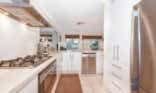 Back inside, the Tasmanian oak kitchen is ready to be enjoyed. It includes stainless-steel appliances (canopy rangehood, Blanco 900mm stainless-steel upright oven with six-burner gas cooktop, Fisher & Paykel dual-drawer stainless-steel dishwasher), stainless-steel splashback, dual pantries, space for a double fridge and open shelving.