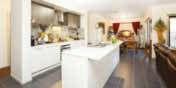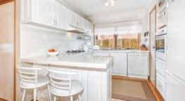 control, while the study retains the privacy necessary for working from home. It is next to the lounge room, meals area and feature-packed kitchen. The latter will thrill those who love to cook, with its wide Caesarstone-topped island bench that doubles as a breakfast bar, double sink with pull-out spray tap, walk-in pantry, stainless-steel appliances (900mm Technika oven with six-burner gas cooktop and Bellisima dishwasher) and glass splashback.