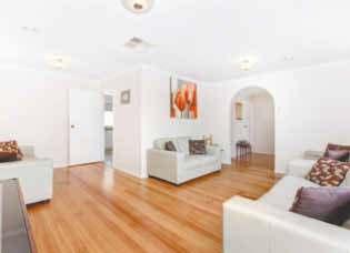 Set well back from the street and behind low-maintenance gardens, the front door opens to a wide hall that showcases its timber floors.