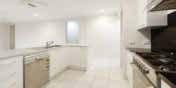 Illuminated by its tryptych of tall windows, the suite has a walk-in wardrobe, en suite with large Premium shower, toilet and Caesarstone-topped vanity.